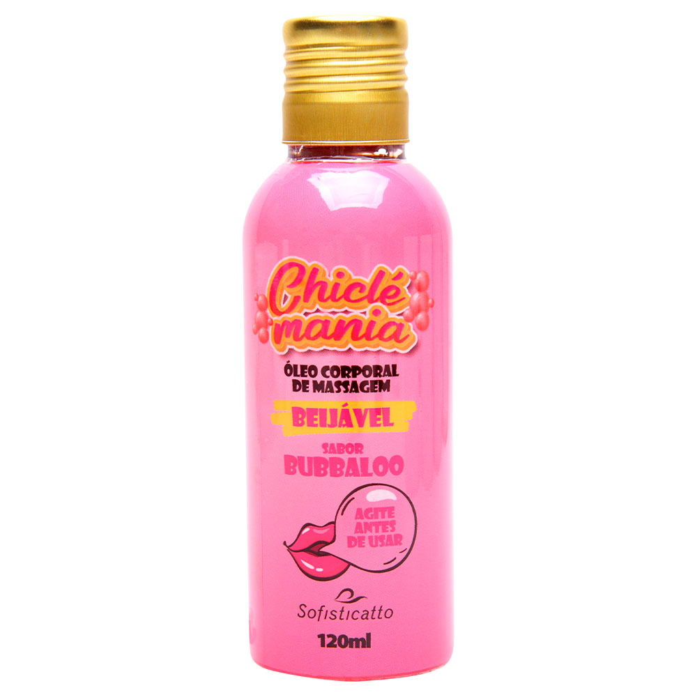 Chiclé Mania Óleo Corporal Beijável 120ml Da Sofisticatto. Desfrute do poder de uma massagem sensual com o delicioso sabor de chiclete Bubbaloo com o Chiclé Mania Óleo Corporal Beijável da Sofisticatto. Este óleo corporal foi desenvolvido para transformar seu momento a dois em algo inesquecível, combinando o toque íntimo e a deliciosa fragrância de chiclete. Ideal para massagens que exploram os pontos sensíveis do corpo, este óleo proporciona uma experiência de prazer e conexão intensas!