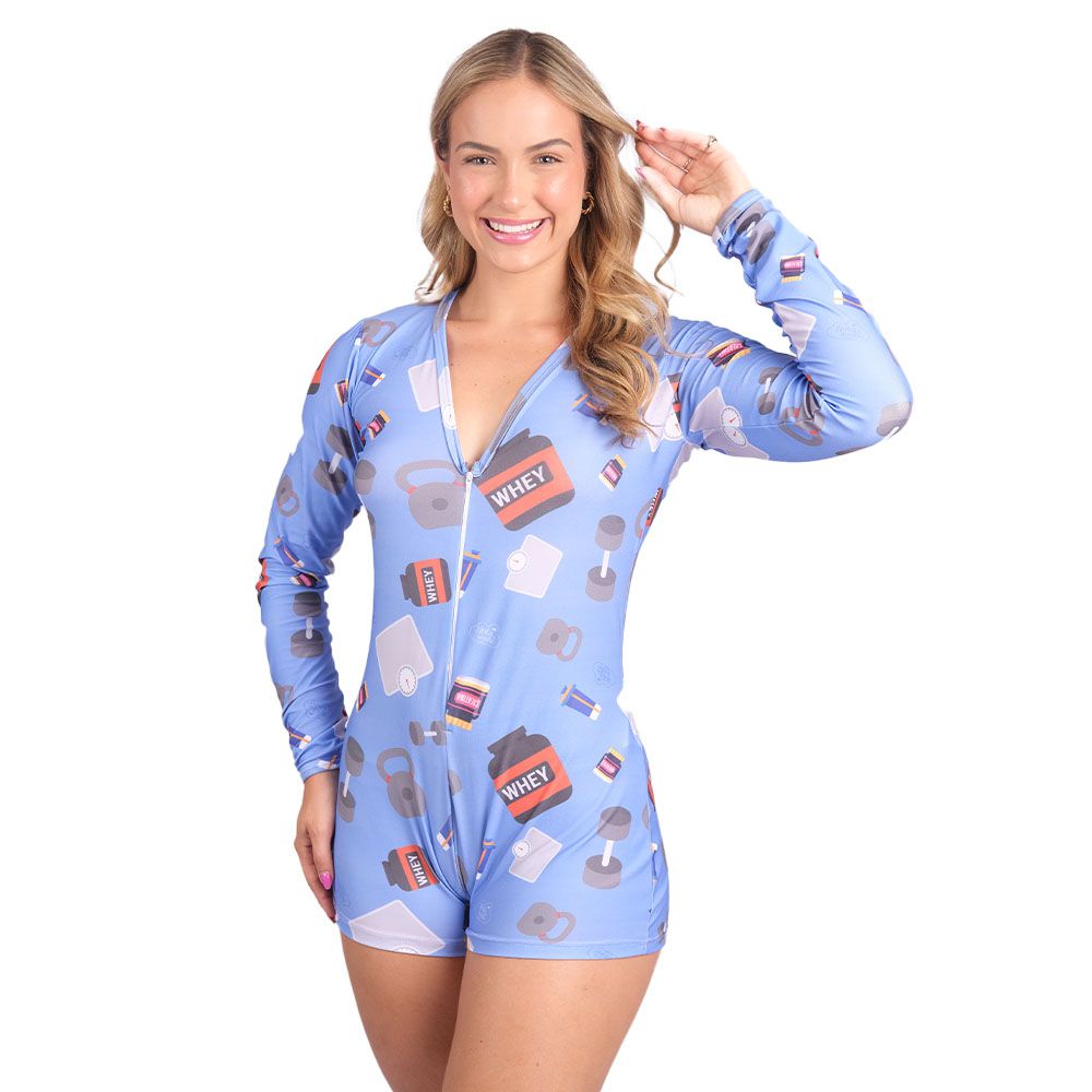 Pijama Ana Júlia Estampa Academia Modelo Macaquinho - Marca Gota de Sonho. Mantenha seu estilo fitness até mesmo durante o descanso com o pijama Ana Júlia da Gota de Sonho. Este dinâmico modelo Macaquinho, adornado com uma estampa inspirada em academia, é perfeito para as entusiastas de um estilo de vida ativo que não abrem mão de conforto e tendência até na hora de dormir!