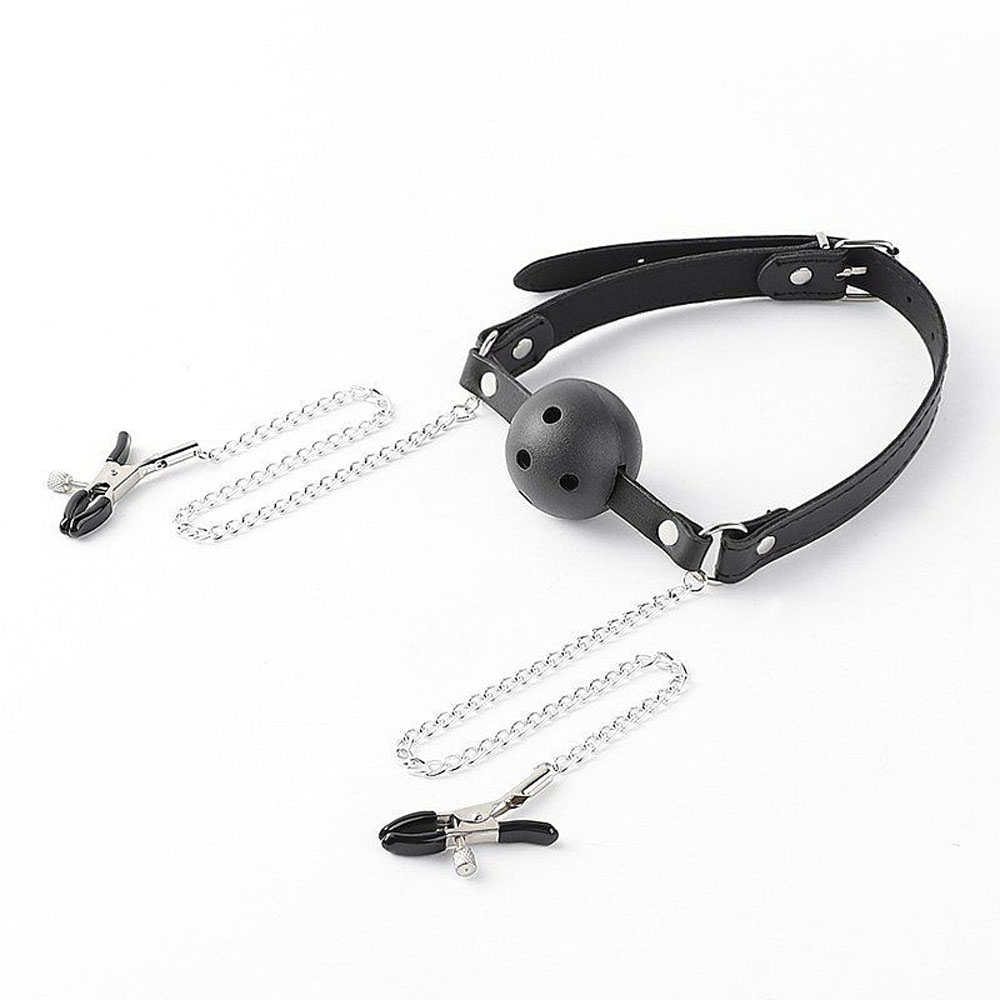 Design Provocante: Mordaça com prendedor de mamilos e correntes, oferecendo um visual ousado e excitante.