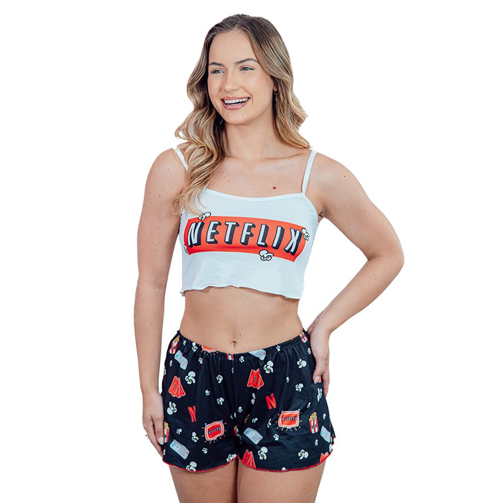 Pijama Virgínia com Estampa Netflix Modelo Short Doll - Marca Gota de Sonho. Introduzindo o exclusivo pijama Virgínia da Gota de Sonho, desenhado especialmente para os fãs de noites de maratona de séries. Este elegante modelo Short Doll apresenta uma estampa inspirada na Netflix, perfeito para quem adora conforto e estilo enquanto desfruta de seus programas e filmes favoritos!