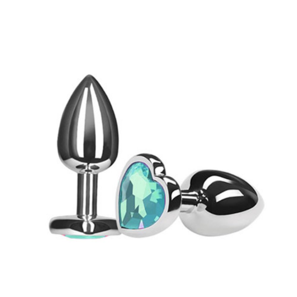 Plug anal em alumínio médio, possui em sua base uma pedra colorida lapidada como uma jóia em formato coração. Acompanha um saquinho em tecido totalmente discreto.