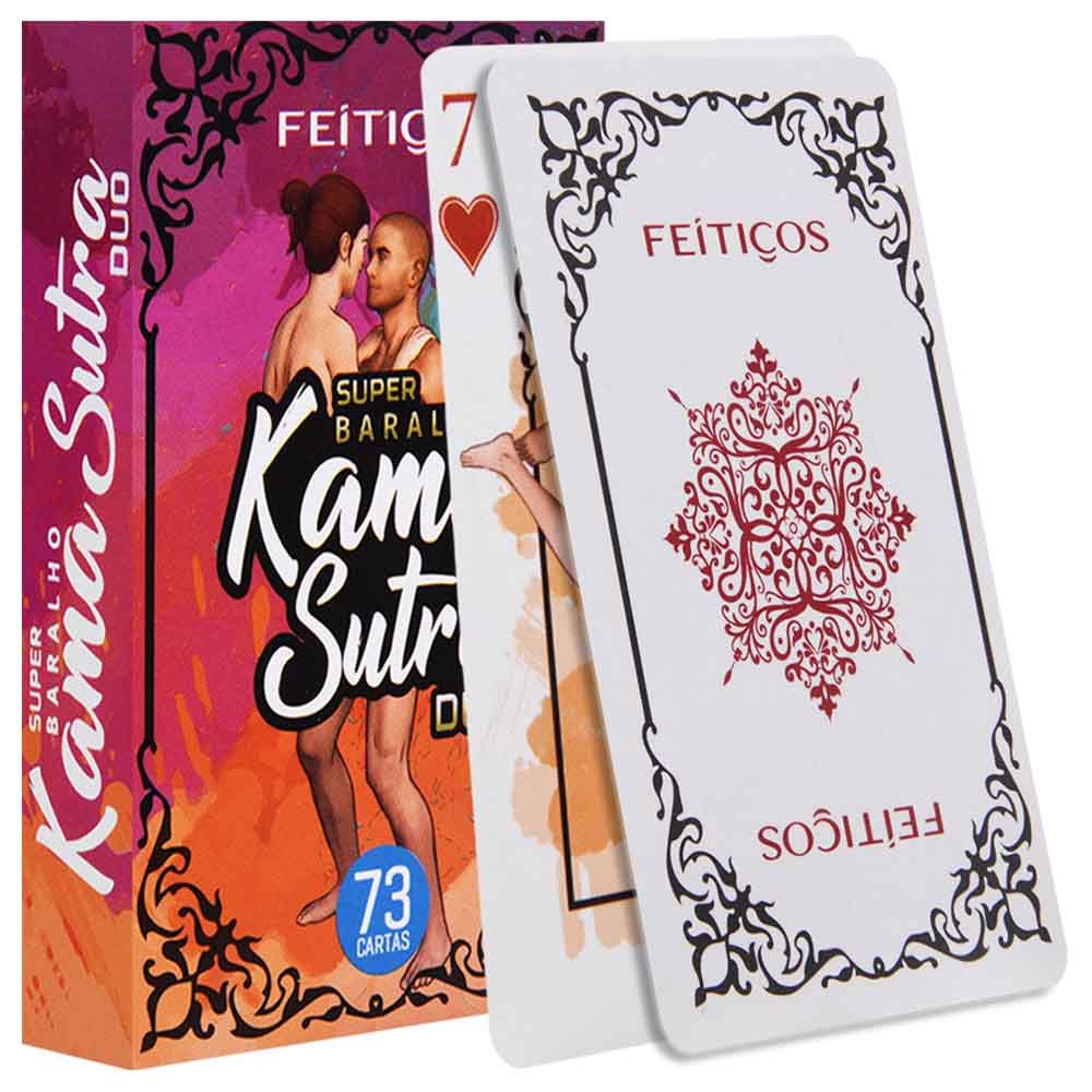 Super Baralho Kama Sutra Duo Feitiços é um mega baralho com 73 cartas criado especialmente para incrementar sua vida sexual, é livre de parabeno, feito com papel cartão, possui diferentes posições a cada carta e tem 20 cartas especiais que podem ser utilizadas para jogar Uno.
