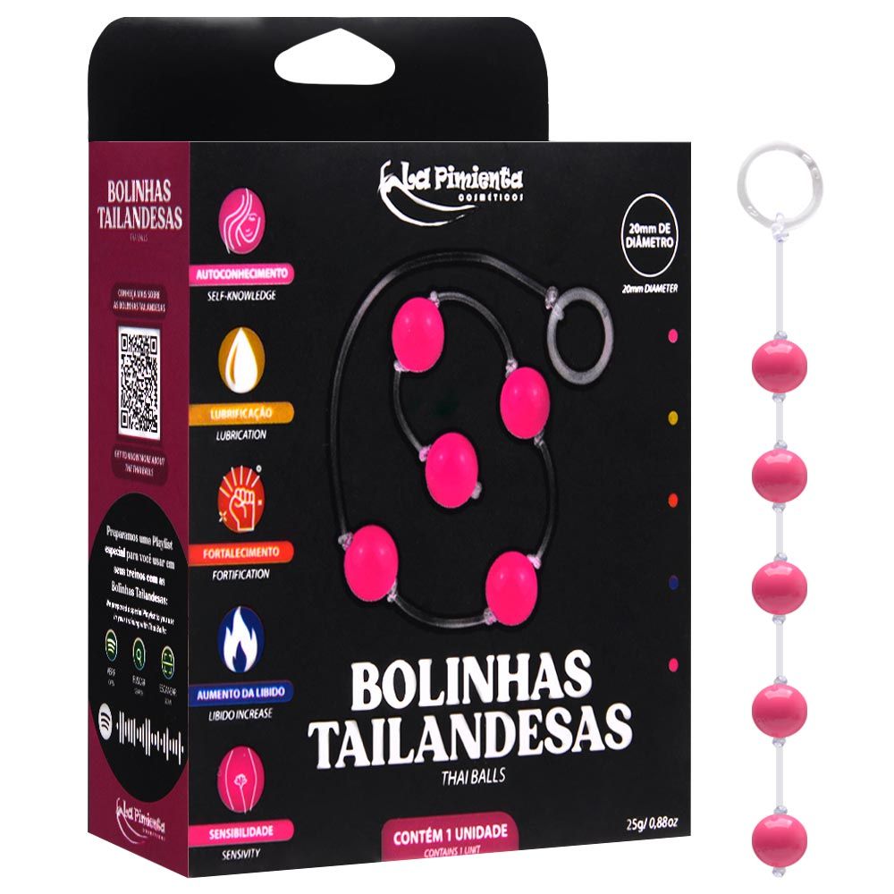 Acessório composto por 5 esferas ligadas por um cordão de silicone, ideal para a prática do pompoarismo, ginástica pélvica e para oferecer novas sensações ao sexo! E seus benefícios não param por aí: * Fortalece o músculo vaginal * Previne a incontinência urinária * Favorece o autoconhecimento * Melhora a lubrificação * Aumenta a libido * Oferece maior sensibilidade na região Modo de Uso: Lubrifique as Bolinhas Tailandesas e introduza delicadamente uma de cada vez na vagina ou na região anal. Para facilitar a entrada, contraia os músculos pélvicos, realizando um movimento de sucção. No começo, você pode auxiliar com os dedos, até que consiga realizar sem ajuda Cuidados: Manter fora do alcance de crianças. Caso haja irritação, sensibilização ou dor, suspenda o uso. Não utilizar este produto se a pele apresentar inflamações ou fissuras. Não compartilhar esse produto com nenhum parceiro Material: 5 bolas plásticas leitosas de 20mm, argola acrílica e cordão de silicone de 2mm