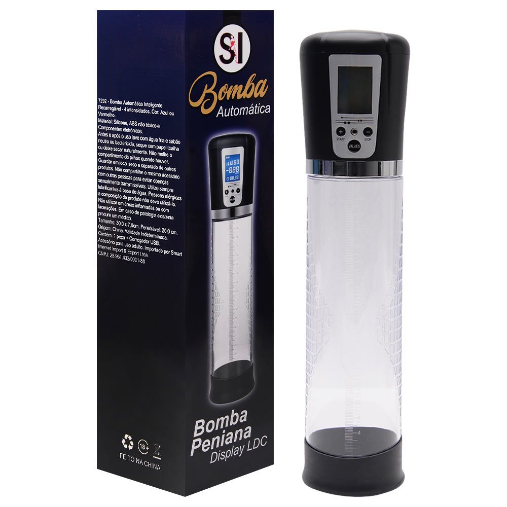 Bomba Peniana 2 Automática com painel LCD, possui anel em silicone. Ótima para tratar a ejaculação precoce, a impotência masculina e desenvolver o órgão masculino. Melhora a irrigação sanguínea do pênis proporcionando melhor ereção. 4 Modos de Intensidades! Modo de uso: Coloque o anel no tubo, após Coloque o pênis dentro do tubo e pressione rente a virilha para que o ar não saia. Aperte a bomba para começar a sucção. Use 10 minutos diário, caso sinta alguma fisgada ou dor é o momento de parar e só retomar o exercício no dia seguinte Material: ABS e Silicone Tipo de bateria: Recarregável via USB (acompanha cabo) Medidas: 30cm de comprimento, 7cm de espessura (medidas aproximadas) Higienização: Lavar com água e sabão neutro antes e após o uso, seque com papel toalha ou deixe secar naturalmente. Depois de seco guarde na embalagem original. Não compartilhar e não expor a temperatura superior a 50°C