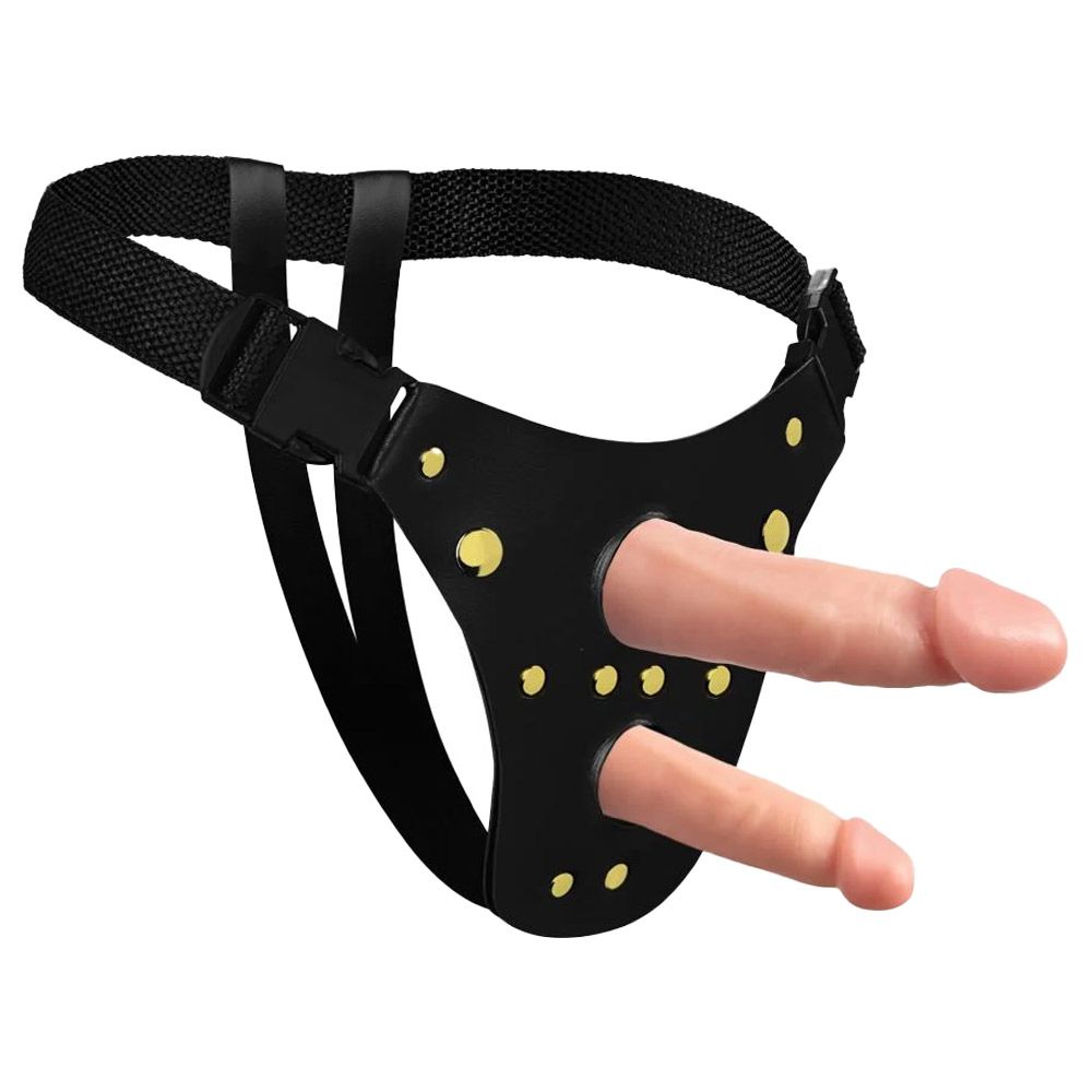 Fixe os pênis os introduzindo nos furos da cinta. Ajuste firmemente a cinta ao seu corpo