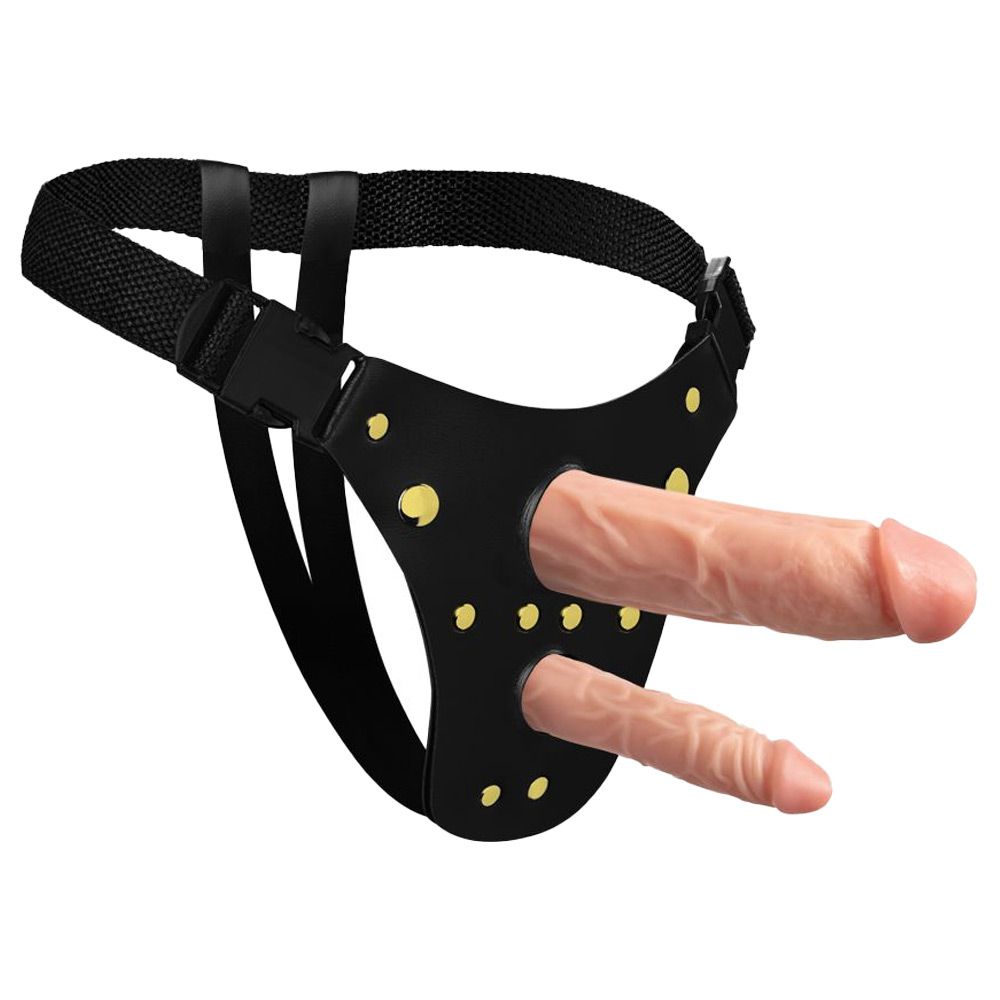 Fixe os pênis os introduzindo nos furos da cinta. Ajuste firmemente a cinta ao seu corpo