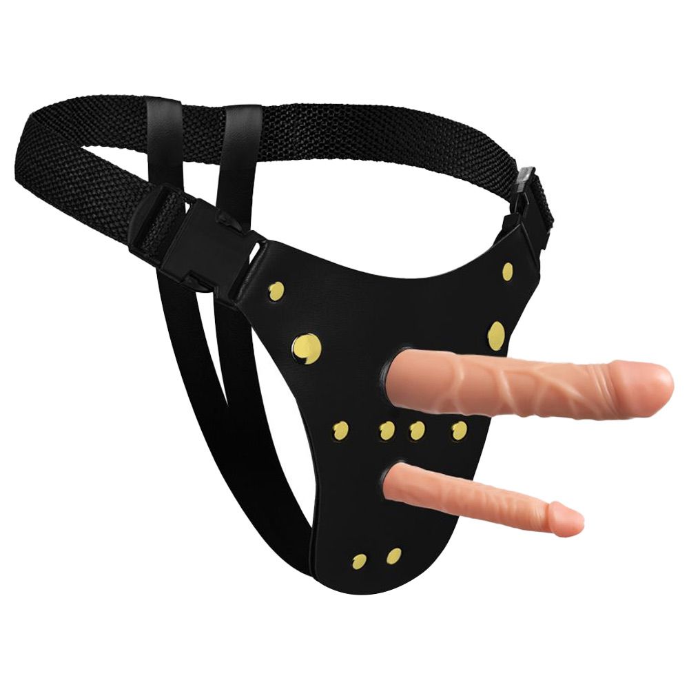 Fixe os pênis os introduzindo nos furos da cinta. Ajuste firmemente a cinta ao seu corpo