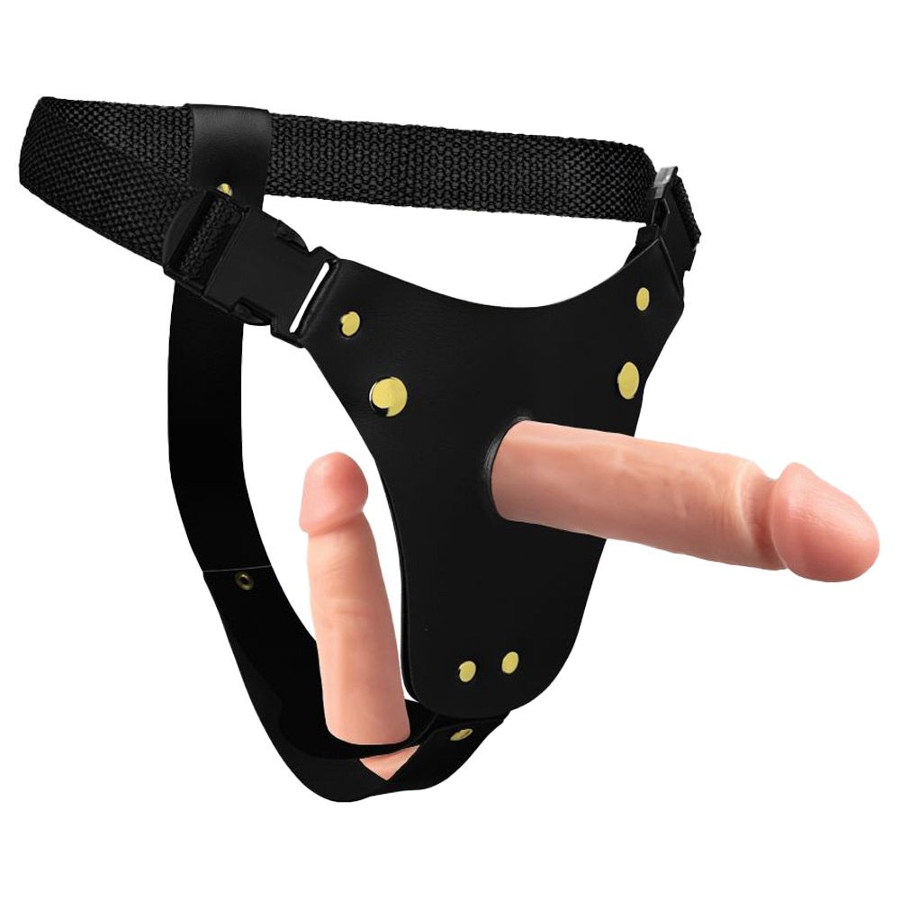 Fixe os pênis os introduzindo nos furos da cinta. Ajuste firmemente a cinta ao seu corpo