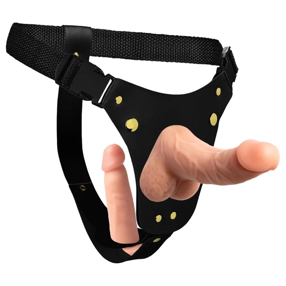 Fixe os pênis os introduzindo nos furos da cinta. Ajuste firmemente a cinta ao seu corpo