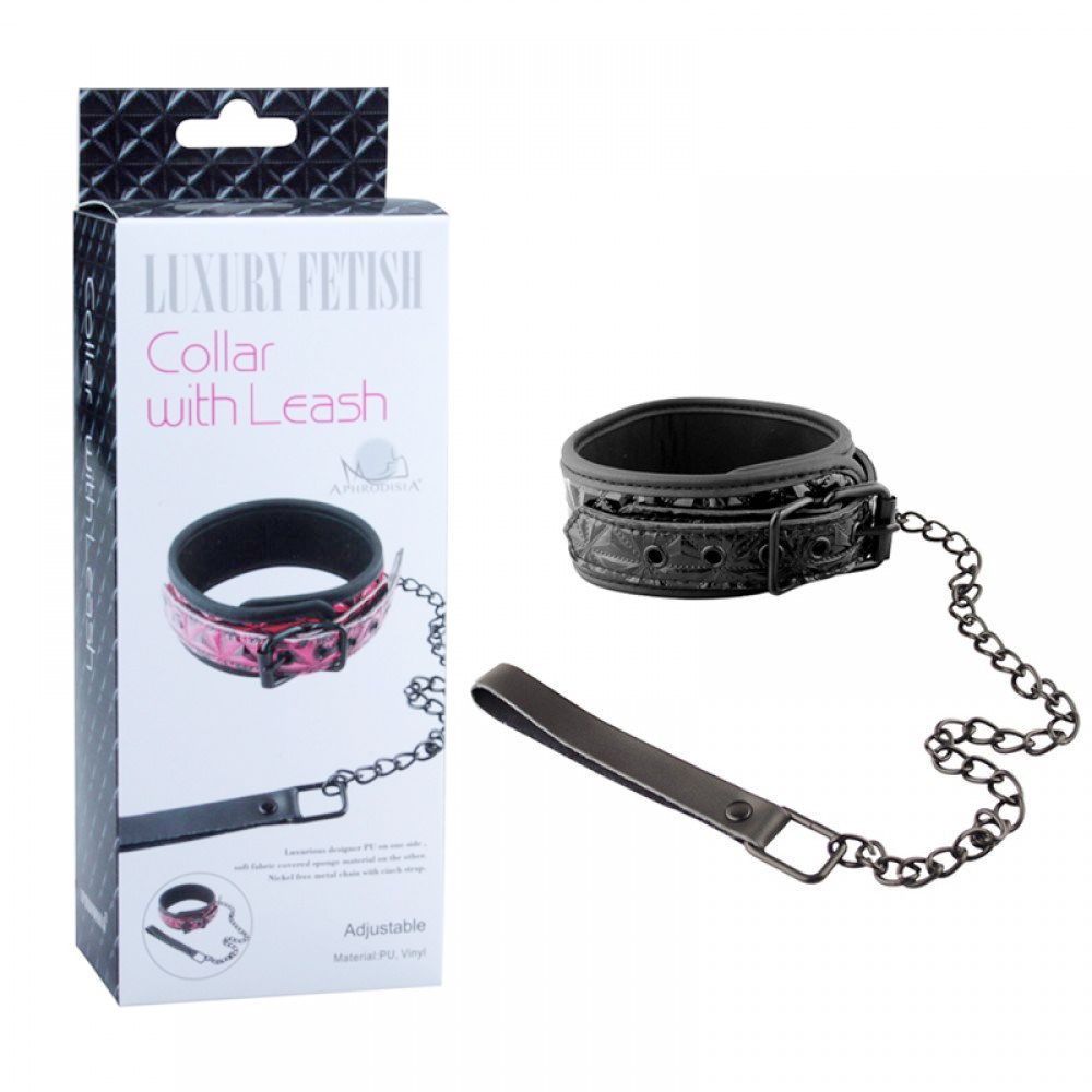 Coleira com um visual brilhante com desenhos em alto-relevo. A parte interna é composta por um material que proporciona um toque agradável à pele. Possui corrente de metal e uma alça de couro sintético. O fecho é composto por uma fivela que proporciona um eficaz e descomplicado ajuste.
