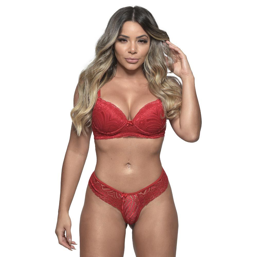 Este conjunto de lingerie é o equilíbrio perfeito entre delicadeza, sensualidade e conforto. Totalmente rendado, o sutiã 1/2 taça vem com um bojo que ajuda a realçar o contorno natural do busto. Um elegante drapeado na base do sutiã acrescenta um toque de sofisticação à peça. A calcinha, modelo tanga, é ideal para quem busca máximo conforto sem abrir mão do estilo.