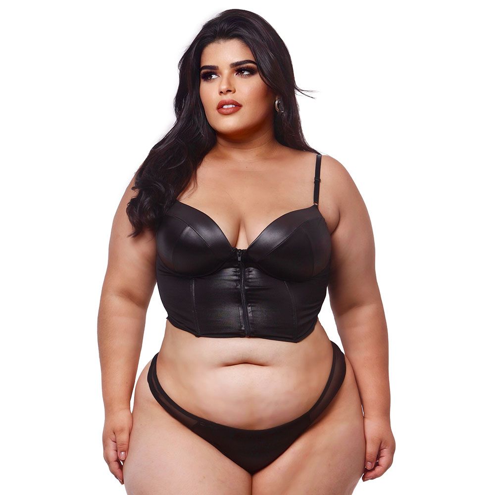 Conjunto Cropped Plus Size confeccionado em cirrê liso com detalhe de tule liso nas costas, possui 02 barbatanas frontais para um caimento top no corpo. Acompanha fio dental. Observações: * Meias comercializadas separadamente * Parte do tulle nas laterais e desenho da renda poderá ser alterada (sendo com liso ou estampa) sem prévio aviso, isso se deve ao fabricante que sempre muda conforme a importação ou nova fabricação