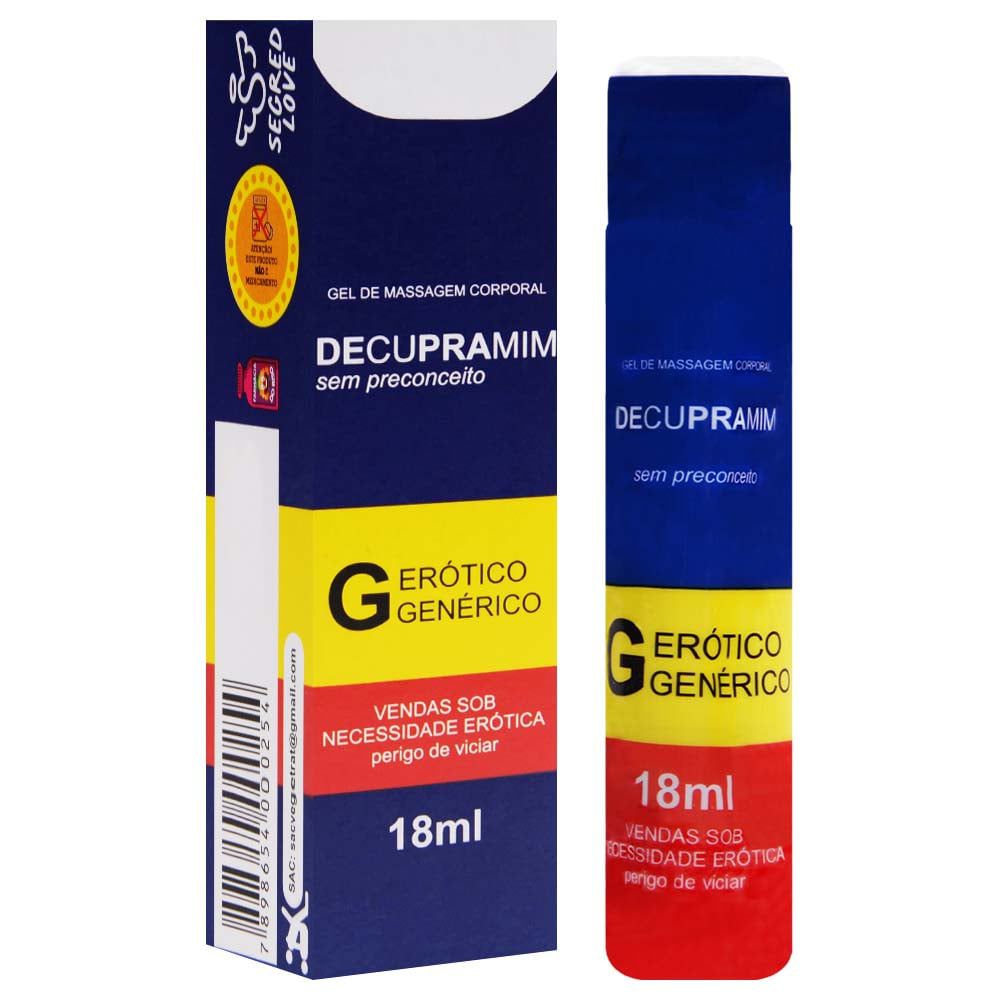 Com dificuldades de convencer o parceiro? Seus problemas acabaram! Decupramim é um gel de massagem com poder dessensibilizante, ideal para prática do sexo anal. Proporciona a você e seu parceiro momentos prazerosos. Modo de uso: Aplique o gel na região do ânus de 2 a 3 minutos antes da relação Precauções: Não usar em regiões com lesões, lacerações ou inflamações. Em caso de contato com os olhos, enxágue-os com água em abundância. Manter o produto em lugar fresco e ao abrigo do calor e da luz. Mantenha fora do alcance de crianças. Não reutilizar a embalagem Contém: 18ml