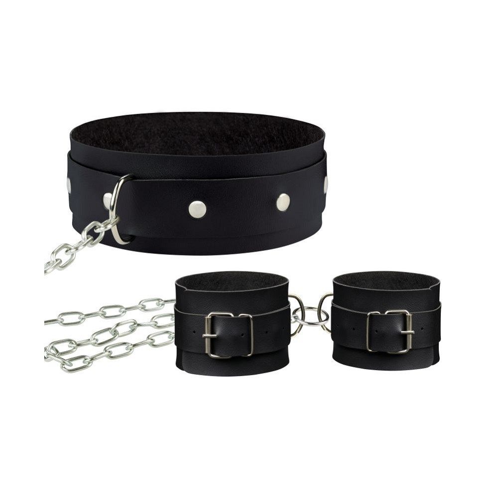 Kit contém uma coleira e um par de algemas com corrente. Confeccionadas artesanalmente em material sintético semelhante à couro com revestimento interno aveludado. Ajustáveis e reguláveis de acordo com suas medidas para garantir conforto, fácil acomodação e uso correto de seu acessório. Detalhes de fivelas, fechos, travas e corrente em metal niquelado que asseguram qualidade e durabilidade. Medidas: Largura da coleira 4,8cm Comprimento da coleira 42cm Largura da algema 5,5cm Comprimento da algema 30cm Comprimento da corrente 40cm Contém: 01 Coleira e 01 par de Algemas com corrente