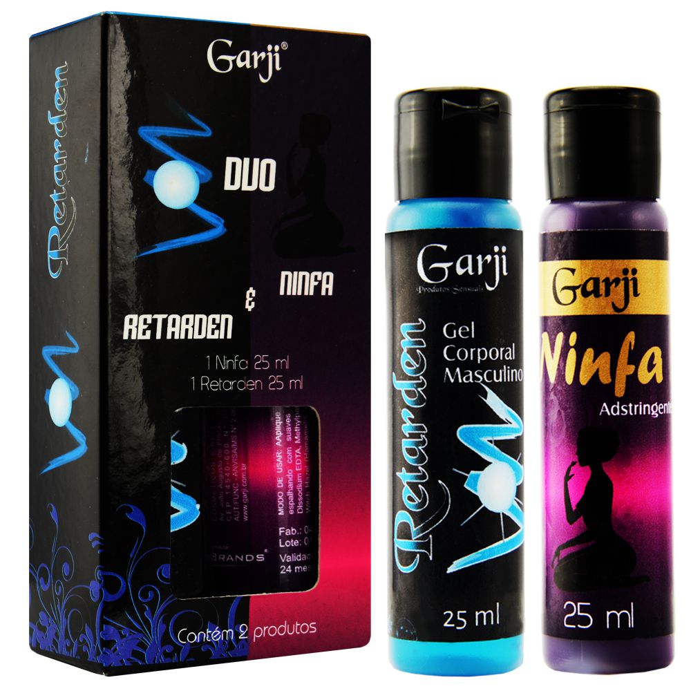 NINFA: Gel adstringente redutor do canal vaginal. Vem com aplicador, que facilita o uso. Aplicar no canal vaginal pelo menos 20 minutos antes da penetração. RETARDEN: Retardador do orgasmo masculino. MODO DE USAR: Aplicá-lo no pênis ereto, e esperar cerca de 1 a 2 minutos. Massagear bastante a glande do pênis. Não deve ser utilizado sem preservativo, pois retira a sensibilidade do(a) parceiro(a). Se for utilizado sem preservativo, retire todo excesso antes da penetração. Contém: 01 Ninfa de 25ml 01 Retarden 25ml