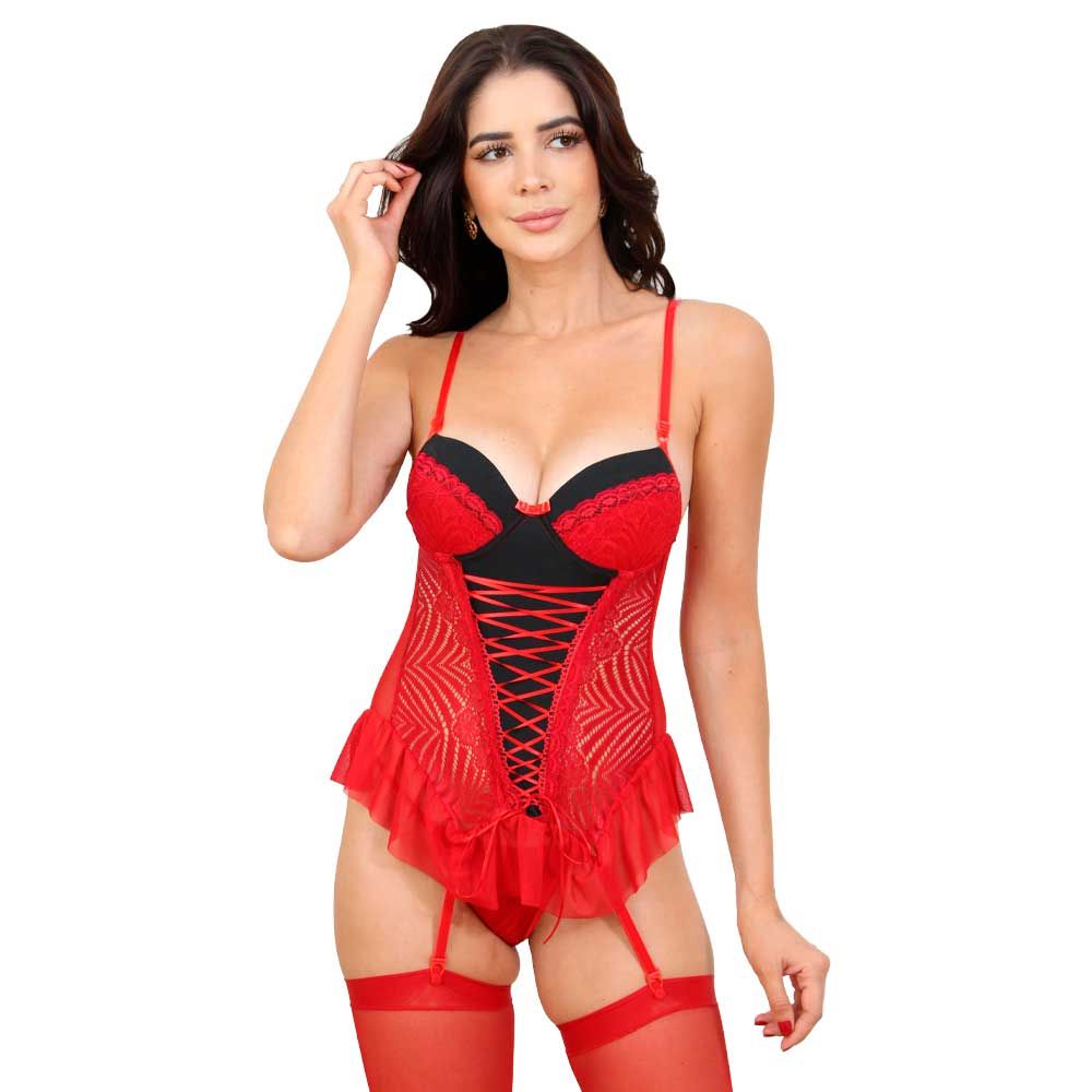 Espartilho confeccionado em tule liso e rendada bordada com detalhe frontal trançado. Acompanha fio dental. Observações: * Meias comercializadas separadamente * Parte do tulle nas laterais e desenho da renda poderá ser alterada (sendo com liso ou estampa) sem prévio aviso, isso se deve ao fabricante que sempre muda conforme a importação ou nova fabricação