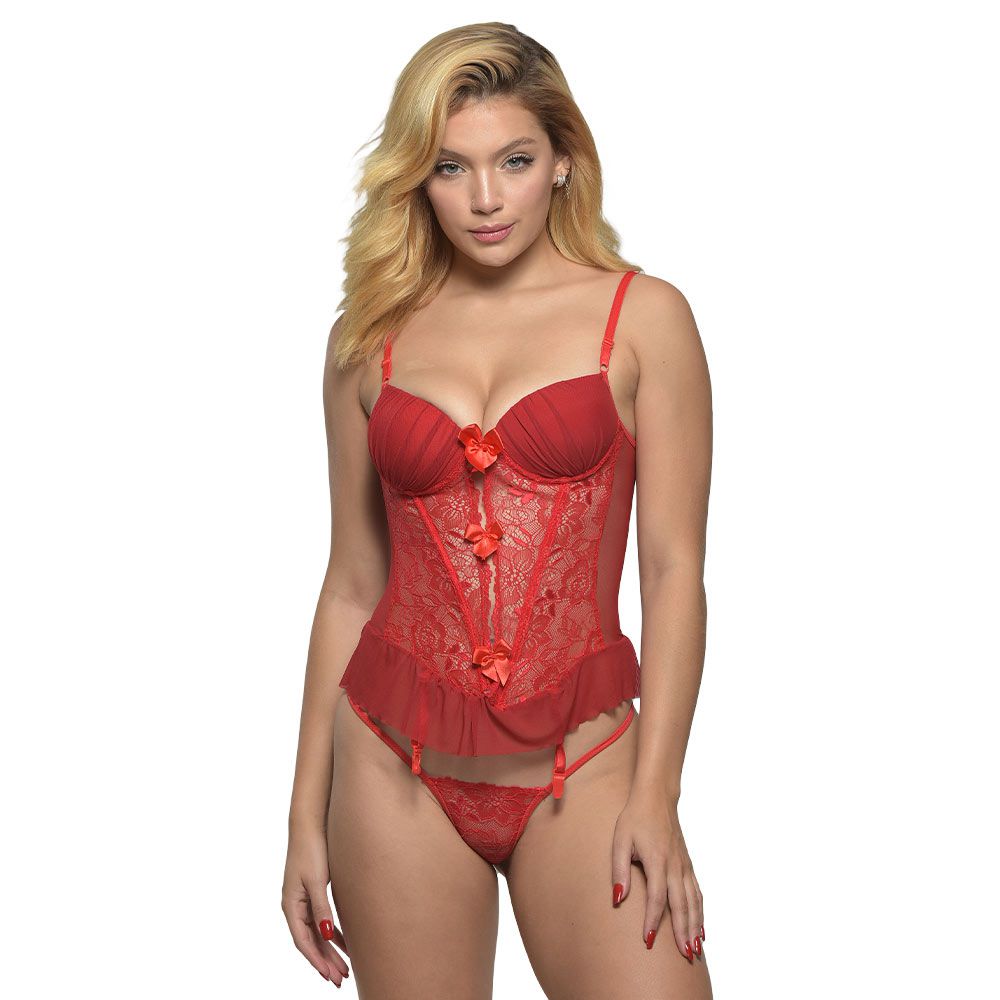 Espartilho confeccionado em tule bordado com detalhe frontal. Acompanha fio dental. Observações: * Meias comercializadas separadamente * Parte do tulle nas laterais e desenho da renda poderá ser alterada (sendo com liso ou estampa) sem prévio aviso, isso se deve ao fabricante que sempre muda conforme a importação ou nova fabricação