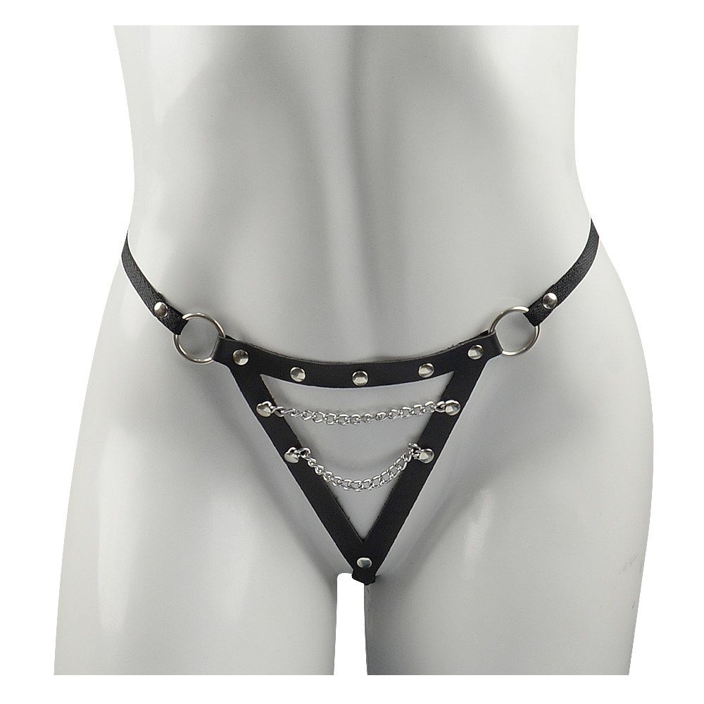 Calcinha fio dental em couro sintético Dominadora com corrente em diagonal! Cuidados: Limpar com pano úmido. Secar a sombra. Conservar fora da luz solar e não expor a temperatura superior a 50ºC