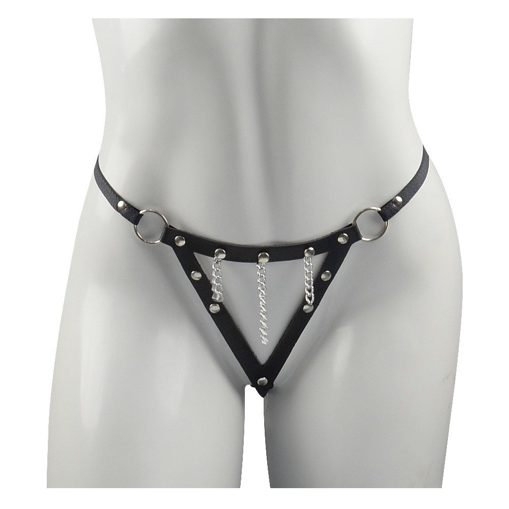 Calcinha fio dental em couro sintético Dominadora detalhe corrente pendurada! Cuidados: Limpar com pano úmido. Secar a sombra. Conservar fora da luz solar e não expor a temperatura superior a 50ºC