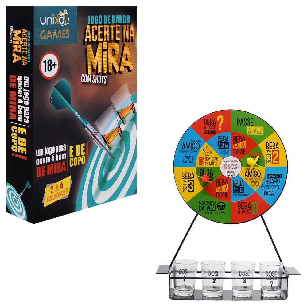 Jogo de Dardo Acerte na Mira com Shots Unika Games! Como jogar: Primeiramente definam o jogador que irá iniciar e a sequência dos próximos jogadores. Joguem o dardo e a mira de cada um definirá as ações, o jogo fica mais divertido se variarem as bebidas para cada shot Contém: 01 Suporte com alvo 30 X 30cm 02 Dardos 04 Copos de shot