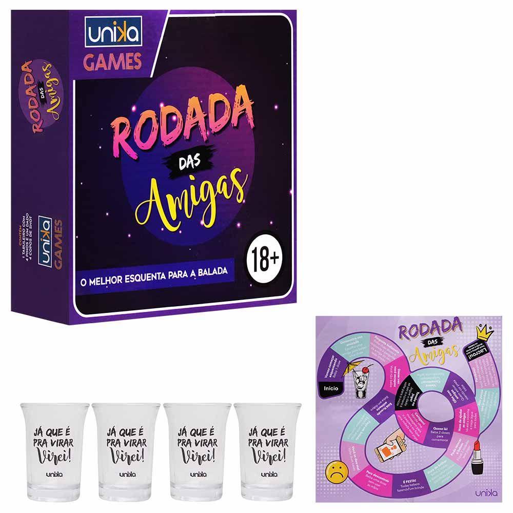 Jogo Rodada das Amigas Esquenta Balada Unika Games é um entretenimento perfeito para tornar o esquenta com suas amigas bem mais divertido, vem com quatro pinos, um dado, quatro copos e um tabuleiro.