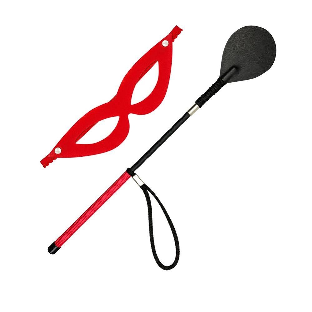 Chibata arredondada tiazinha confeccionada artesanalmente em sintético semelhante à couro com cabo emborrachado revestido de poliéster trabalhado. Máscara tiazinha também fabricada em sintético semelhante à couro com revestimento interno aveludado que garante conforto. Fino recorte no formato dos olhos para adaptação perfeita no rosto. Medidas: Comprimento da chibata 40cm Largura da ponteira da chibata 6,5cm Altura da ponteira da chibata 10cm Comprimento da máscara 22cm Largura da máscara 6cm Elástico para fixação da máscara 30cm Contém 01 Chibata e 01 Máscara