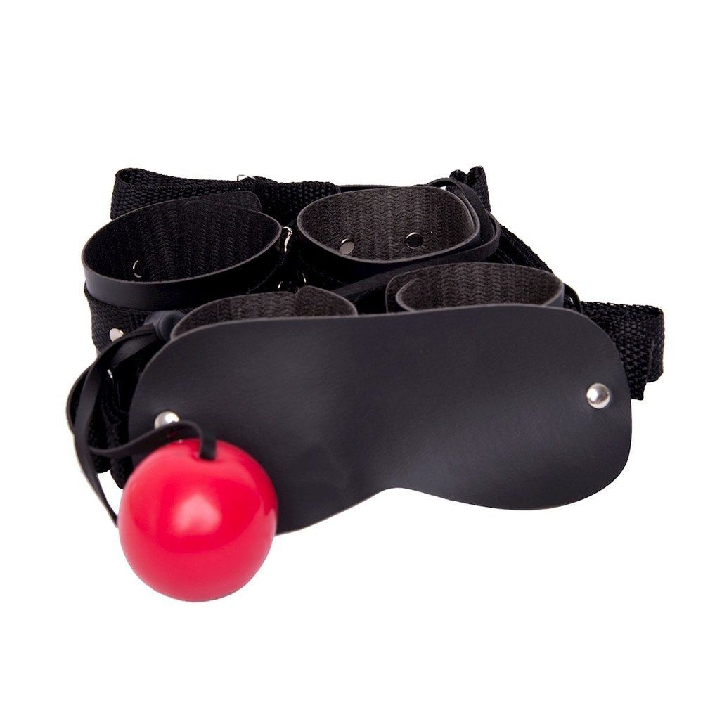 Kit completo, composto por algemas para tornozelos e braços com tiras de 80cm cada, venda e mordaça bola, com acabamento Luxo de 1ª linha. Algemas e venda confeccionadas em couro sintético. Cuidados: Limpar com pano úmido. Secar a sombra. Conservar fora da luz solar e não expor a temperatura superior a 50ºC