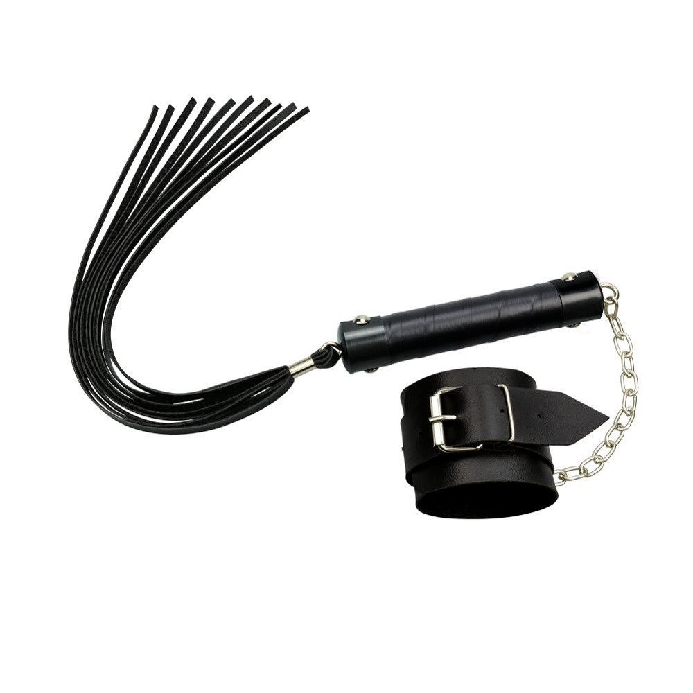 Chicote com 10 tiras confeccionado artesanalmente em sintético semelhante à couro, resistente e flexível para proporcionar toque com impacto confortável no corpo. Bracelete confeccionado no mesmo material com revestimento interno aveludado. Ajustáveis e reguláveis de acordo com suas medidas de pulso para garantir conforto, fácil acomodação e uso correto do acessório. Detalhes de fivelas, corrente, fecho e travas em metal niquelado que garantem qualidade e durabilidade. Medidas Bracelete: Largura 5,5cm Comprimento 30cm Medidas Chicote: Base do cabo em madeira 15cm Tiras do chicote 40cm Alça 33cm Contém: 01 Unidade Referências: L188 - L189