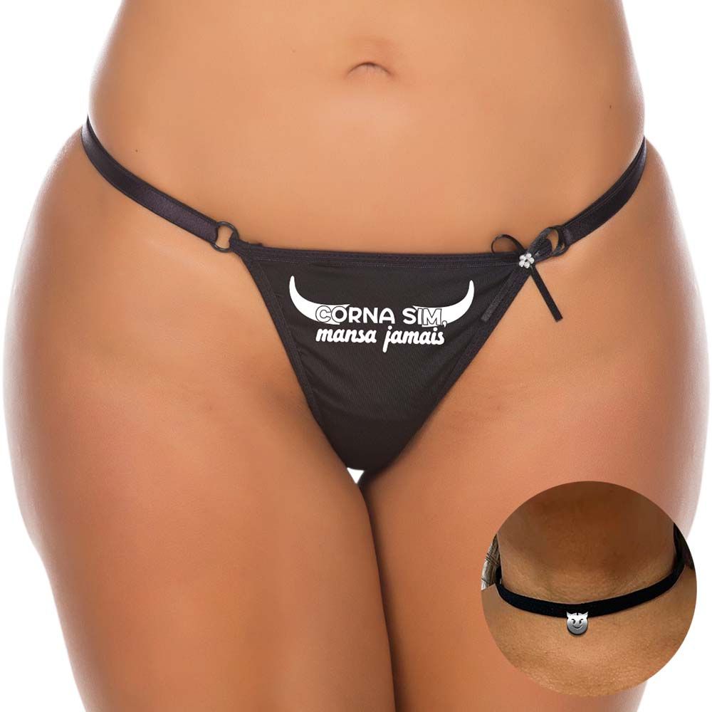 Calcinha Fio Dental Corna Sim, Mansa Jamais da Pimenta Sexy. Fio Dental em tecido liso sintético com frase de efeito na parte da frente, acompanha gargantilha, ótima para de ousar e surpreender, super sensual e ousado, surpreenda seu parceiro! Tamanho: Único (veste do P ao G)