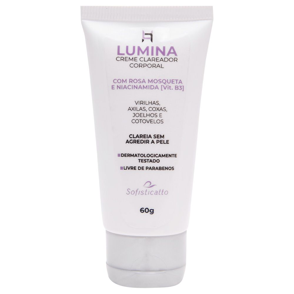 Lumina Creme Clareador, sabe aquelas partes do corpo que se tornam mais escuras por causa do atrito ou de procedimentos como depilação nas axilas, virilha, cotovelos e joelhos? Lumina é feito para elas. Formulado com extrato de Rosa Mosqueta e Niacinamida (Vitamina B3) corrige as diferenças de tonalidade da pele da virilha, axilas, coxas, joelhos e cotovelos, deixando-a iluminada e uniforme. Clareia sem agredir a pele! Foi dermatologicamente testado e é livre de parabenos.