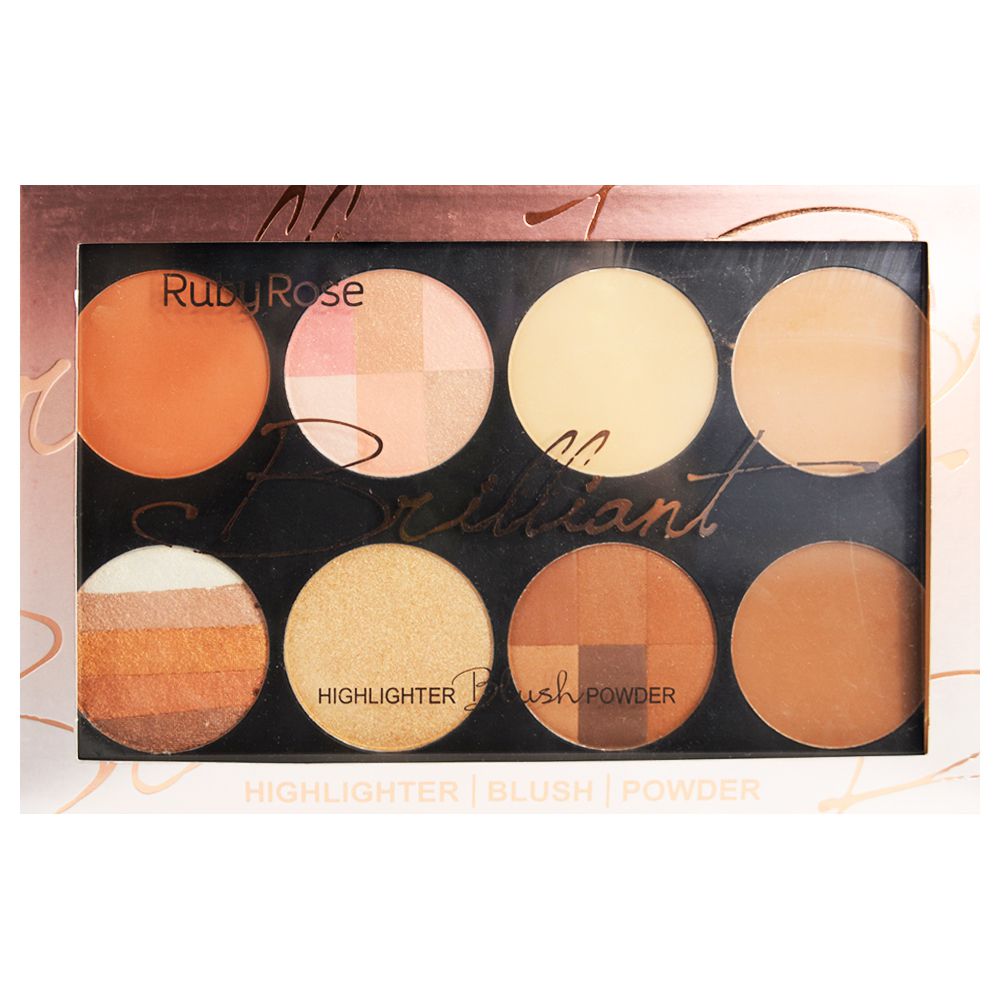 A paleta Brilliant é a mais nova paleta versátil da Ruby Rose. Ela reúne os nossos queridinhos shimmer brick, blush soft touch, iluminador bare skin 6 em 1, pó compacto, blush e iluminador em só uma paleta. Ela tem 3 tons de pó compacto, um para pele clara, outro média e um para negra, sendo que o tom mais escuro pode ser utilizado para fazer contorno dependendo do tom da sua pele. Além disso, tem 1 shimmer na cor 3 que pode ser usado como blush ou iluminador e dá um glow incrível na pele. Também tem 1 highlight bare skin 6 em 1 na cor 4 e o blush soft touch na cor 3. Essa paleta possui uma pigmentação incrível, e ótima durabilidade, com ela você não fica na mão! Modo de uso: Com um pincel, aplique o pó compacto da sua tonalidade para selar a maquiagem, em seguida faça o contorno e depois aplique o blush da sua preferência e por fim aplique o iluminador nas áreas estratégicas do rosto Precauções: - Uso externo - Não aplique sobre a pele irritada ou lesionada - Se houver qualquer sinal de irritação, descontinue o uso do produto - Mantenha sempre bem fechado, longe da luz e calor e do alcance de crianças
