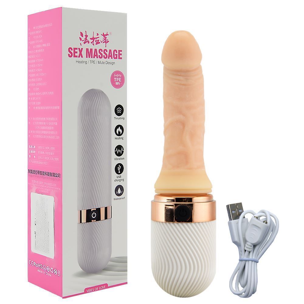 Pênis realístico luxo função VAI e VEM, recarregável, design moderno na cor branca com detalhe dourado, com tampa proterora removível. Contém 7 modos de vibrações e auto aquecimento. Modo de uso: Segure pressionando o botão de power na base do vibrador iniciando a vibração, cada vez pressionada alterna o tipo de vibração, para desligar é só manter pressionado o botão de power até a parada total Material: Silicone cirúrgico super macio e plástico ABS Tipo de bateria: Utiliza cabo USB (incluso) Medidas: Mede 22cm de comprimento por 5,3cm de espessura, sendo penetráveis 14cm de comprimento por 3,5cm de largura (medidas aproximadas)