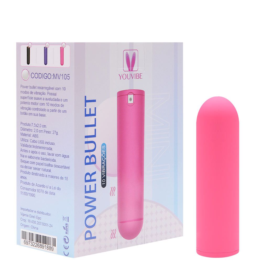 Power bullet recarregável com 10 modos de vibração Youvibe da Vipmix. Possui superfície suave a aveludada e um potente motor com 10 modos de vibração controlado a partir de um botão em sua base! Medidas Aproximadas: 7,5 x 2cm Material: ABS Baterias: Utiliza Cabo USB incluso Cuidados: Antes e após o uso, lavar com água fria e sabonete bactericida. Seque com papel toalha descartável ou deixar secar natural