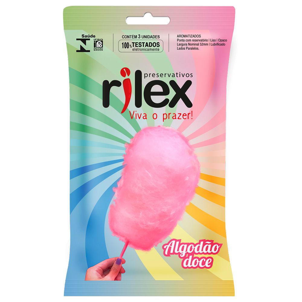 Com aroma adocicado do nosso preservativo de algodão doce, a Rilex te leva a um parque de diversões particular. E ai, topa? Composição: Látex de borracha natural, óleo de silicone (lubrificante) e aroma artificial de algodão doce Quantidade: 03 unidades por pacote Registro Anvisa: 80950310012 Instruções: Produto de uso único. Não fracionar. Proteja este produto do calor, da umidade e da luz. Abrir o envelope somente na hora do uso. Leia as instruções de uso na bula interna do produto