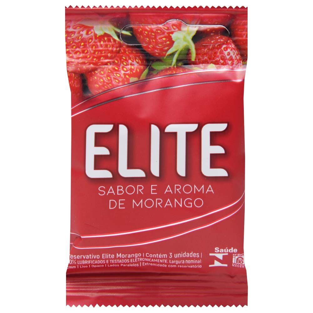 Preservativo Elite Morango, pacote com 3 unidades, da marca Blowtex. Este preservativo possui um sabor e aroma de morango, tornando a experiência íntima mais doce e envolvente.