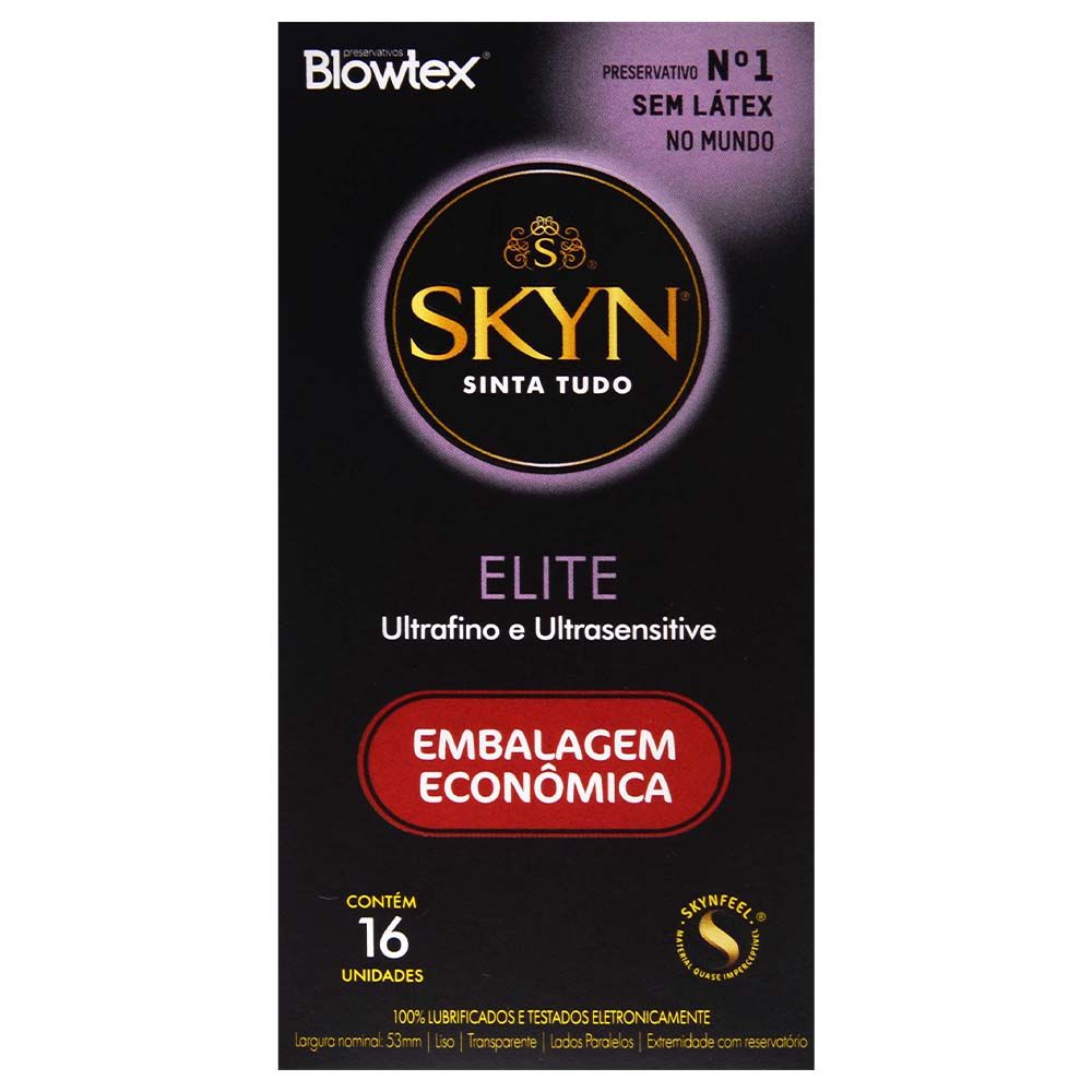 Preservativo Skyn Sinta Tudo da Blowtex, versão Elite, em um pacote com 16 unidades. Este preservativo é feito com a tecnologia Skynfeel, um material que não contém látex natural, proporcionando uma sensação de conforto e sensibilidade.