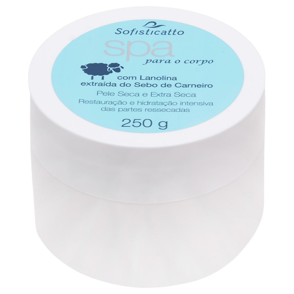 Spa para o Corpo com Sebo de Carneiro Sofisticatto. Para peles secas e extras secas, o creme SPA para o Corpo, tem em sua formulação a Lanolina que é conhecida popularmente por Sebo de Carneiro. Tem alto poder de hidratação e retenção de água na pele. Pode ser aplicada em todo o corpo!