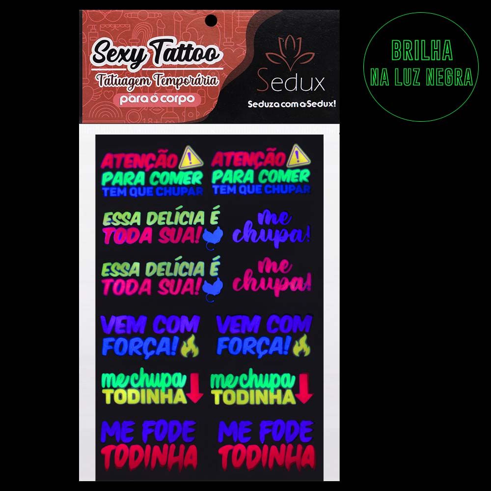 Tem que chupar, a tatuagem removível neon da Sedux é perfeita para esquentar seus instantes de prazer, acompanha 13 desenhos, dura entre um até dois dias, é de fácil remoção, é temporária, não é tóxica e nem alérgica! * O que é? Tatuagem de fácil remoção * Qual a função? Tornar a prática sexual mais intensa e gostosa * Por que é especial? Simples de colocar e possui 13 alternativas de desenhos * Como utilizar? Destaque o desenho que mais lhe agradar, tire a proteção de plástico, insira na pele seca e limpa, coloque água pelo verso e retire após 30 segundos * O que não fazer? Tenha cautela para não ter atrito no local em que a tatuagem foi aplicada * Dimensões da cartela: 10 x 15 cm (medidas aproximadas)