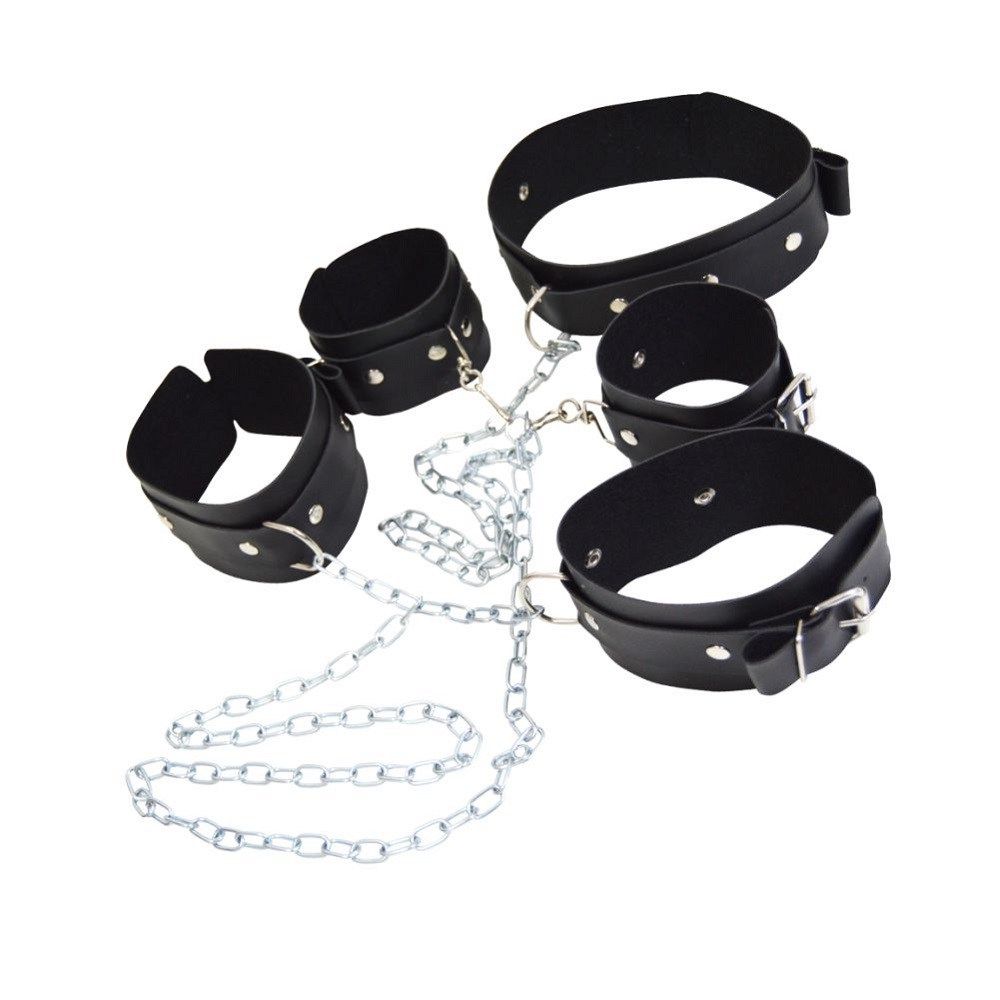 Kit contém um par de algemas, uma coleira e um par de tornozeleiras com corrente. Algemas, coleira e tornozeleiras confeccionadas em sintético semelhante à couro com revestimento interno aveludado. Ajustáveis e reguláveis de acordo com suas medidas para garantir conforto, fácil acomodação e uso correto do acessório. Detalhes de fivelas, fecho, travas e corrente em metal niquelado que asseguram qualidade e durabilidade. Versátil, possui fecho removível, proporcionando uso do par de algemas separadamente, para que esta dupla função permita realizar todo prazer e satisfação que deseja. Medidas: Largura da algema 5,5cm Comprimento da algema 30cm Largura da tornozeleira 5,5cm Comprimento da tornozeleira 39,5cm Comprimento da corrente 1,40cm Contém: 01 Unidade