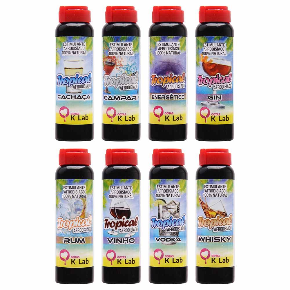 Bebidas Tropicais K-lab. Para os apreciadores de bebidas, o Tropical Afrodisíaco K-lab é um energético potente, com a aroma e sabor original de Whisky, Cachaça, Campari, Rum, Energético, Vodka e Gin. Feito para esquentar a relação, aumentando seu desejo sexual e trazendo uma explosão de sensações na hora "H".
