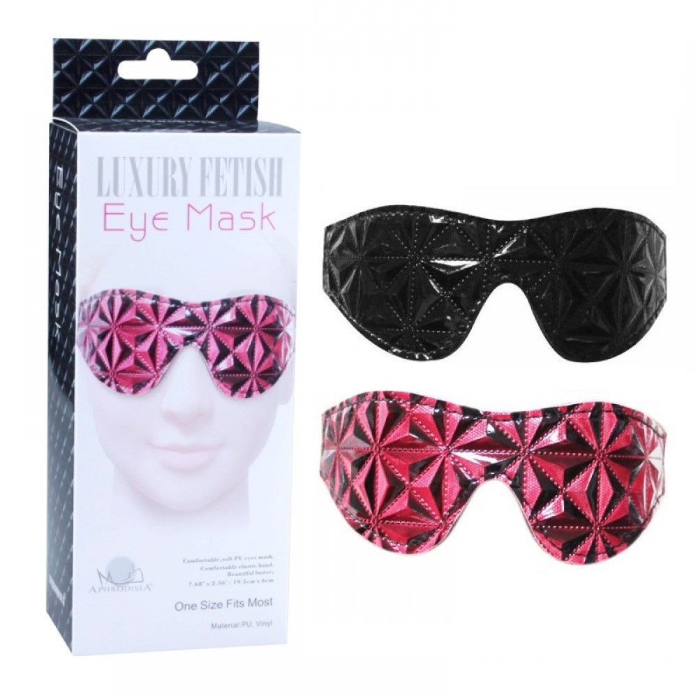Venda para os olhos com acabamento brilhante e alto relevo, com forro interno e tiras ajustáveis. Material PU.