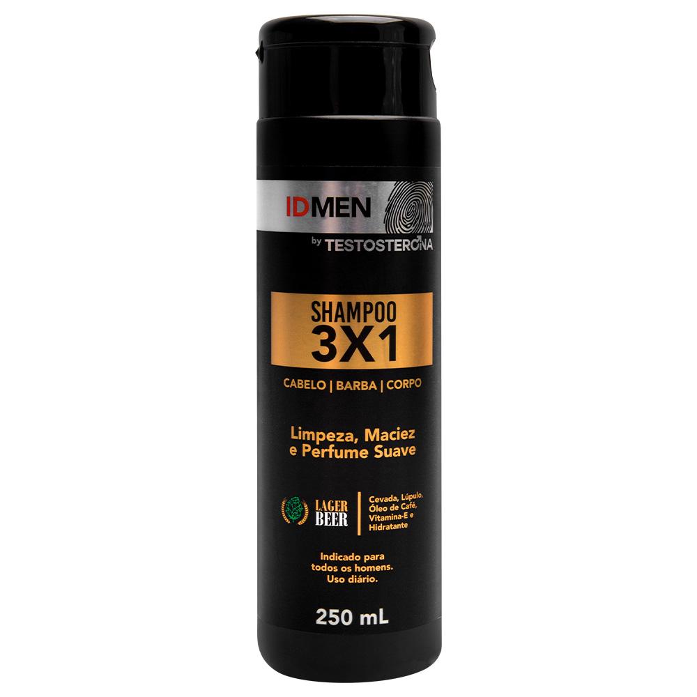 Shampoo 3x1 Macho Lager Beer 250ml Idmen: Limpeza Completa e Refrescante. O Shampoo 3x1 Macho Lager Beer 250ml Idmen é a escolha perfeita para homens que buscam praticidade e eficácia em seus cuidados diários. Desenvolvido pela ID MEN by Testosterona, este shampoo 3 em 1 oferece a limpeza ideal para cabelo, barba e corpo, proporcionando suavidade e uma sensação refrescante durante e após o banho. Seus componentes naturais controlam a oleosidade do couro cabeludo, enquanto o aroma refrescante das cervejas Lager confere um toque único e revigorante!